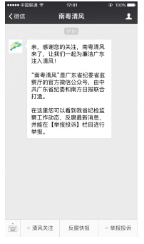?。ㄒ唬┙M織黨員干部關(guān)注省紀委官方微信平臺“南粵清風(fēng)”。可通過微信查找或掃描下圖二維碼關(guān)注“南粵清風(fēng)”微信公眾號。