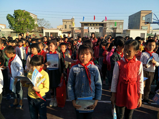 2018年11月29-30日珠江委關工委一行來到珠江委對口扶貧點陸豐市甲子鎮雨亭村開展扶貧助學活動,省直機關關工委副主任曹淑珍應邀參加。下午3點多大家不顧長途勞頓,即刻趕往雨亭小學。學校領導非常重視助學活動,全校老師和學生們在操場上集合參加活動。首先學生代表為關工委的同志們佩戴紅領巾,行隊禮。接著關工委的同志們為學校評選出的62名優秀學生贈送大禮包(新書包、學習用具、保溫杯、雨傘),并向學校捐贈圖書。珠江委離退處郭萬里處長代表珠江委關工委發言,他指出本次開展助學活動是省直關工委和珠江委關工委第三次共同來看望慰問雨亭小學的師生,主要目的是獎勵一批品學兼優的學生和捐贈一批益智書籍給學校圖書館,他最后激勵全體學生要向本次受表揚的優秀學生看齊,勤奮讀書,努力成材,將來報效祖國、社會和自己家鄉。最后曹淑珍副主任講話,她代表省直機關關工委向學校師生們表示親切問候,說到她是第二次來到雨亭小學了,看到了雨亭村和雨亭小學經過三年扶貧工作,發生了很大的變化。這次珠江委關工委給你們送來了溫暖和獎勵,她鼓勵孩子們要好好學習天天向上,學好本領做對社會有用的人。活動結束后,大家參觀了宣傳欄、黨員樹,在建文藝體育文化廣場、道路光伏發電、村委會辦公樓改造等扶貧項目工地,以及村容村貌。