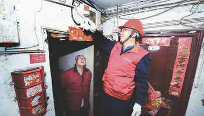 張黎明(右)在天津濱海新區一處老舊居民小區義務安裝節能燈。 資料照片