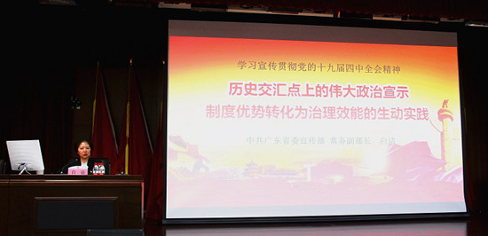 白潔同志圍繞“歷史交匯點上的偉大政治宣示制度優勢轉化為治理效能的生動實踐”主題,深刻闡釋了黨的十九屆四中全會的重大意義、中國特色社會主義制度和國家治理體系的顯著優勢,深入解讀了全會《決定》提出的總體要求、總體目標和重點任務以及加強黨的領導,把制度優勢更好轉化為治理效能等一系列理論和實踐中的重大問題,提出了要切實把思想和行動統一到黨的十九屆四中全會精神上來,充分發揮職能作用,推動新時代審計工作高質量內涵式發展等要求。