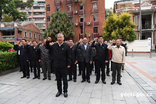 在中共三大會址遺址廣場,由省質監局黨組書記、局長任小鐵領誓,大家面對黨旗,莊嚴肅立、舉起右手、緊握拳頭,重溫入黨誓詞。