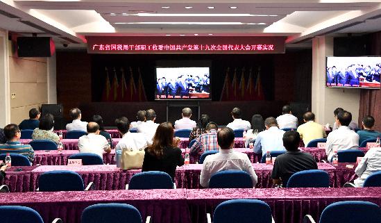 為進一步貫徹落實中國共產黨第十九次全國代表大會精神,廣東國稅局黨組迅速組織136個縣區局、20個市局和省局機關近2.3萬名干部職工認真收看黨的十九大開幕會,第一時間學習領會黨的十九大報告精神。廣東省國稅局黨組書記、局長胡金木同志和在家班子成員與省局機關干部職工在省局四樓會議中心收看了開幕實況,各市、縣(區)國稅局分別在當地組織了收看。