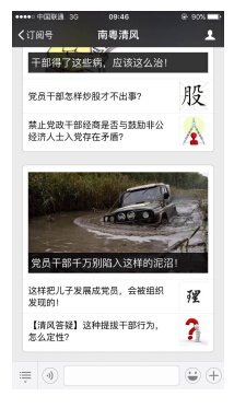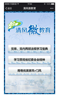 ?。ǘ┮簏h員干部閱讀、收藏相關(guān)學(xué)習(xí)文章。關(guān)注“南粵清風(fēng)”微信公眾號后,進入主界面,如下圖所示: