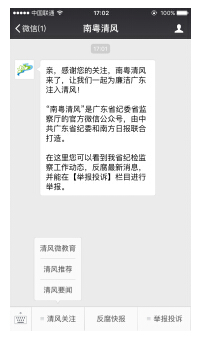 ?。ㄒ唬┙M織黨員干部關(guān)注省紀委官方微信平臺“南粵清風(fēng)”。可通過微信查找或掃描下圖二維碼關(guān)注“南粵清風(fēng)”微信公眾號。