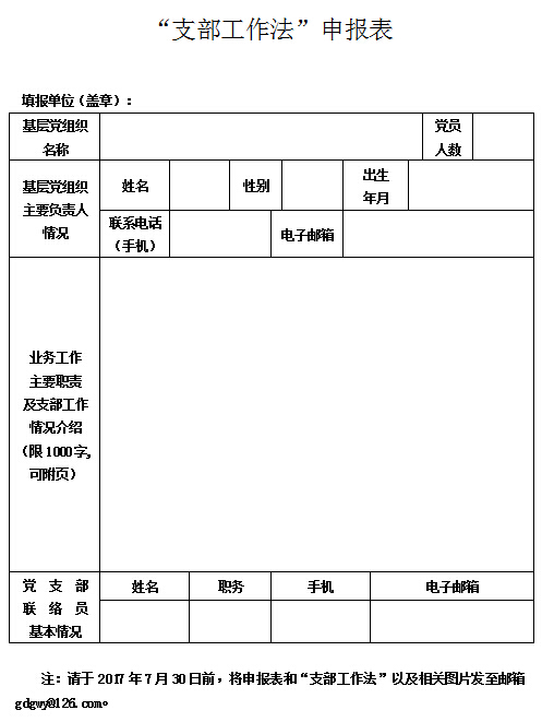 請各單位黨組織對所屬黨支部總結形成的“支部工作法”進行審核把關,并填寫《“支部工作法”申報表》(可在廣東省直機關黨建網公告欄中下載),于2017年7月30日前將《申報表》和“支部工作法”文字材料以及相關圖片以將電子版形式報至郵箱gdgwy@126.com。聯系人:陳炳文,聯系電話:020-83133869.