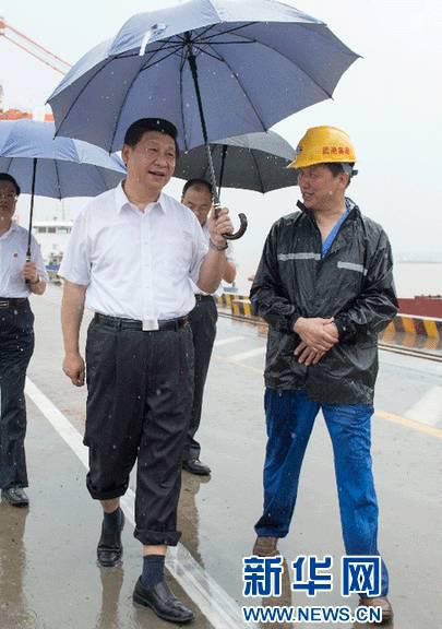 2013年7月21日至23日,中共中央總書記、國家主席、中央軍委主席習(xí)近平在湖北調(diào)研全面深化改革問題和當(dāng)前經(jīng)濟運行情況。 21日上午,習(xí)近平冒雨來到武漢新港陽邏集裝箱港區(qū)考察。 新華社記者 李學(xué)仁 攝