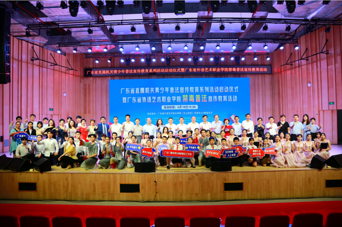 為喜迎黨的二十大的召開,深入貫徹落實習近平法治思想及中共中央辦公廳、國務院辦公廳《關(guān)于加強新時代關(guān)心下一代工作委員會工作的意見》要求,加強青少年法治教育和權(quán)益保護,推動法治教育進學校、進農(nóng)村、進社區(qū)、進家庭、進企業(yè),教育引導青少年樹立尊法、學法、守法、用法意識,提高青少年法治意識,保障青少年身心健康,培養(yǎng)青少年的良好品格,有效預防青少年犯罪。在一年一度的6.26國際禁毒日即將到來之際,6月18日由廣東省文明辦、省普法辦、省禁毒辦、省民政廳、省婦聯(lián)等單位指導,廣東省直屬機關(guān)關(guān)心下一代工作委員會、廣東省司法廳關(guān)心下一代工作委員會、廣東省外語藝術(shù)職業(yè)學院主辦的廣東省直屬機關(guān)青少年普法宣傳教育系列活動啟動儀式暨廣東省外語藝術(shù)職業(yè)學院禁毒普法宣傳教育活動,在廣東省外語藝術(shù)職業(yè)學院順利舉行。省司法廳副廳長陳建、省文明辦副主任吳祖清、省禁毒委員會辦公室副主任馮立洲、廣東省社科院副院長趙細康、廣東外語藝術(shù)職業(yè)學院劉潔副院長、黃澤瑜副書記、郝勇副院長等領(lǐng)導出席啟動儀式。