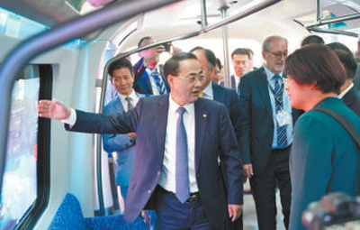 孫永才(前排左一)向國際同行推介新一代碳纖維地鐵車輛。張勇攝(人民視覺)
